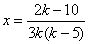 При получении этой формулы необходимо сделать дополнительные предположения k ¹ 0, k ¹ 5. При любом другом значении параметра k формула даёт решение уравнения, которое в этом случае единственно. Теперь рассмотрим оставшиеся варианты. При k = 0 (подставляем в исходное уравнение) уравнение превращается в невозможное равенство 0 = 10. при k = 5 уравнение превращается в тождество 5(15x + 2) = 10 + 75x и, следовательно имеет бесконечно много решений. Ответ. k ¹ 0, то есть k Î(- ¥ , 0)È(0, + ¥). Пример 2. Найти все значения параметра k, при которых уравнение