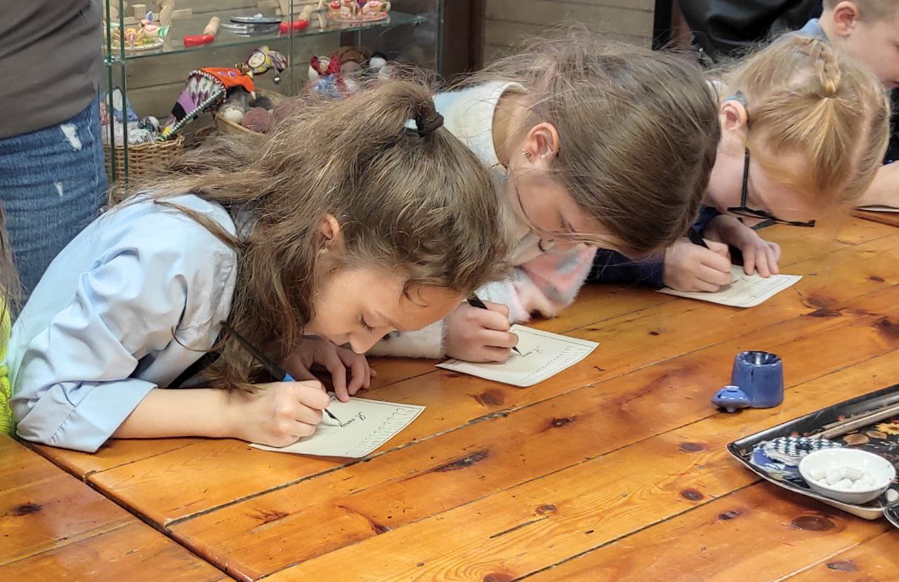 - Мастер-класс по чистописанию. Это был абсолютный хит! Писать пером, макая его в баночку с чернилами, оказалось сложнейшим делом. Дети (да и мы, взрослые) смогли на собственном опыте оценить, каким терпением и трудолюбием обладали их сверстники сто лет назад. Несколько клякс были неизбежны, но это только добавило аутентичности! Дети были в полном восторге от возможности попробовать писать пером и чернилами.